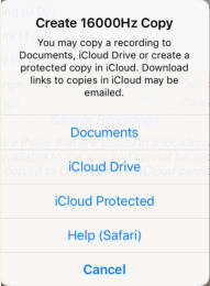 This option allows the export of 16000Hz copies of monitoring session recordings to iCloud Drive and also Documents if session recordings are being stored in a protected area. iCloud Drive is accessible to the user on both the iOS device and their computer. Recordings stored in Documents can be accessed using iTunes file sharing. Both these areas are read and write enabled to the user so the app treats them as unprotected.Once a recording has been copied to iCloud it has to be uploaded to the iCloud server before a link to it can be emailed. The email implementation here uses iOS Mail with pre-populated text all of which can be altered. Both the copy and the email are implemented on the review form where you select recordings.If the email is from the user then there can be no guarantee that the files are unaltered.