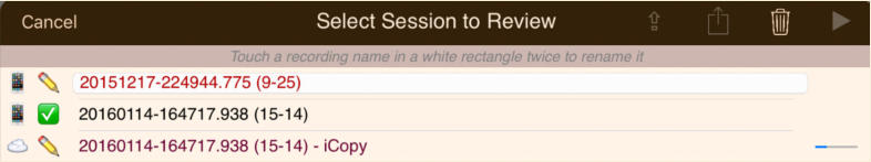 The session review form implements the copies and the emails. The form has a footer that describes the legend used to the left of each session recording shown on the form:The navigation bar at the top of the form has disabled export and email links until a suitable file or copy is selected. Also session recordings that may be renamed have their names contained in a white rectangle:Select a recording that can have copies made and the navigation bar at the top changes to:Touching the export button brings up an option selection dialog. The help link is to this document. In this case we will select iCloud Drive:There is a progress indicator against the recording while the copy is made and it is transferred to its local destination:When the copy completes the form is updated to show the new file:You can’t email links to a session recording until it has been uploaded to the iCloud server. Selecting an iCloud copy which has not been copied up to iCloud as yet results in the disabled mail icon changing to an upload symbol where the selection tick normally is there is now a progress bar:After the upload to iCloud selecting an unprotected iCloud Drive copy results in the navigation bar changing to having the email button enabled:When you touch the button a spinner shows while iCloud makes a copy of the file:After the copy has been made and the download links generated an iOS Mail compose dialog opens with pre-populated text containing the down load links:When making protected copies for email everything is exactly the same up to the point of mail composition. With protected copies a form open allowing you to fill in the recipients (To: & CC:) and a portion of leading text:The received protected email looks as follows. The link at the end of the email is to this document.