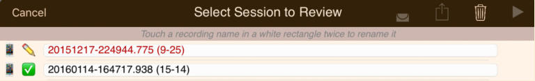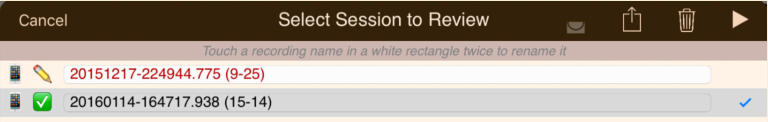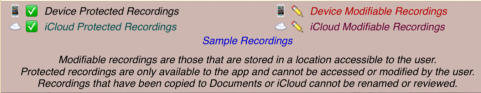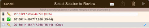 The session review form implements the copies and the emails. The form has a footer that describes the legend used to the left of each session recording shown on the form:The navigation bar at the top of the form has disabled export and email links until a suitable file or copy is selected. Also session recordings that may be renamed have their names contained in a white rectangle:Select a recording that can have copies made and the navigation bar at the top changes to:Touching the export button brings up an option selection dialog. The Help link is to this document. In this case we will select iCloud Drive:There is a progress indicator against the recording while the copy is made and it is transferred to its local destination:When the copy completes the form is updated to show the new file:You can’t email links to a session recording until it has been uploaded to the iCloud server. Selecting an iCloud copy which has not been copied up to iCloud as yet results in the disabled mail icon changing to an upload symbol where the selection tick normally is there is now a progress bar:After the upload to iCloud selecting an unprotected iCloud Drive copy results in the navigation bar changing to having the email button enabled:When you touch the button a spinner shows while iCloud makes a copy of the file:After the copy has been made and the download links generated an iOS Mail compose dialog opens with pre-populated text containing the down load links:When making protected copies for email everything is exactly the same up to the point of mail composition. With protected copies a form open allowing you to fill in the recipients (To: & CC:) and a portion of leading text:The received protected email looks as follows. The link at the end of the email is to this document.