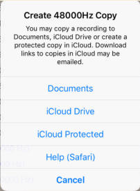 This option allows the export of 48000Hz copies of monitoring session recordings to iCloud Drive and Documents. iCloud Drive is accessible to the user on both the iOS device and their computer. Recordings stored in Documents can be accessed using iTunes file sharing. Both these areas are read and write enabled to the user so the app treats them as unprotected.Once a recording has been copied to iCloud it has to be uploaded to the iCloud server before a link to it can be emailed. The email implementation here uses iOS Mail with pre-populated text all of which can be altered. Both the copy and the email are implemented on the review form where you select recordings.If the email is from the user then there can be no guarantee that the files are unaltered.