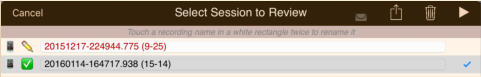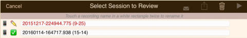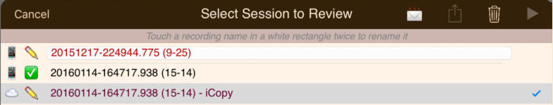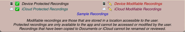 The session review form implements the copies and the emails. The form has a footer that describes the legend used to the left of each session recording shown on the form:The navigation bar at the top of the form has disabled export and email links until a suitable file or copy is selected. Also session recordings that may be renamed have their names contained in a white rectangle:Select a recording that can have copies made and the navigation bar at the top changes to:Touching the export button brings up an option selection dialog. The Help link is to this document. In this case we will select iCloud Drive:There is a progress indicator against the recording while the copy is made and it is transferred to its local destination:When the copy completes the form is updated to show the new file:You can’t email links to a session recording until it has been uploaded to the iCloud server. Selecting an iCloud copy which has not been copied up to iCloud as yet results in the disabled mail icon changing to an upload symbol where the selection tick normally is there is now a progress bar:After the upload to iCloud selecting an unprotected iCloud Drive copy results in the navigation bar changing to having the email button enabled:When you touch the button a spinner shows while iCloud makes a copy of the file:After the copy has been made and the download links generated an iOS Mail compose dialog opens with pre-populated text containing the down load links:When making protected copies for email everything is exactly the same up to the point of mail composition. With protected copies a form open allowing you to fill in the recipients (To: & CC:) and a portion of leading text:The received protected email looks as follows. The link at the end of the email is to this document.