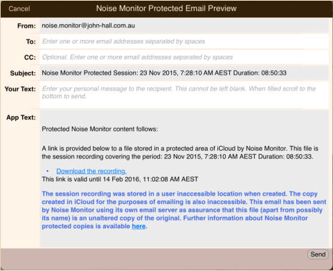 Versions of the app downloaded after mid January 2016 store session recordings in a protected area inaccessible to yourself, prior versions stored them in Documents where they were accessible to iTunes file sharing. Regardless of when the app was downloaded when this option is enabled all future monitor recordings are stored in protected app storage where they cannot be modified. Older recordings that were stored in Documents cannot be made protected.The export of 16000Hz copies to iCloud is done to a protected inaccessible area in iCloud. Once again the copy has to be uploaded to the iCloud server before a link to it can be emailed. In this case as we have a session recording that has always been stored in a protected area the email of the download links also has to be protected if we are to guarantee that it is a protected and unaltered 16000Hz copy of the original monitor recording. The email is sent using the app’s own email server which is enabled for this purpose. You are able to enter the recipients, CC copies and initial user text. The app adds the links and text guaranteeing that the links are to unaltered copies of the original recordings.If the email is from Noise Monitor (noise.monitor@john-hall.com.au) then to the best of our ability I can guarantee they are original unaltered copies.
