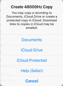 This option allows the export of 48000Hz copies of monitoring session recordings to iCloud Drive and Documents. iCloud Drive is accessible to the user on both the iOS device and their computer. Recordings stored in Documents can be accessed using iTunes file sharing. Both these areas are read and write enabled to the user so the app treats them as unprotected.Once a recording has been copied to iCloud it has to be uploaded to the iCloud server before a link to it can be emailed. The email implementation here uses iOS Mail with pre-populated text all of which can be altered. Both the copy and the email are implemented on the review form where you select recordings.If the email is from the user then there can be no guarantee that the files are unaltered.